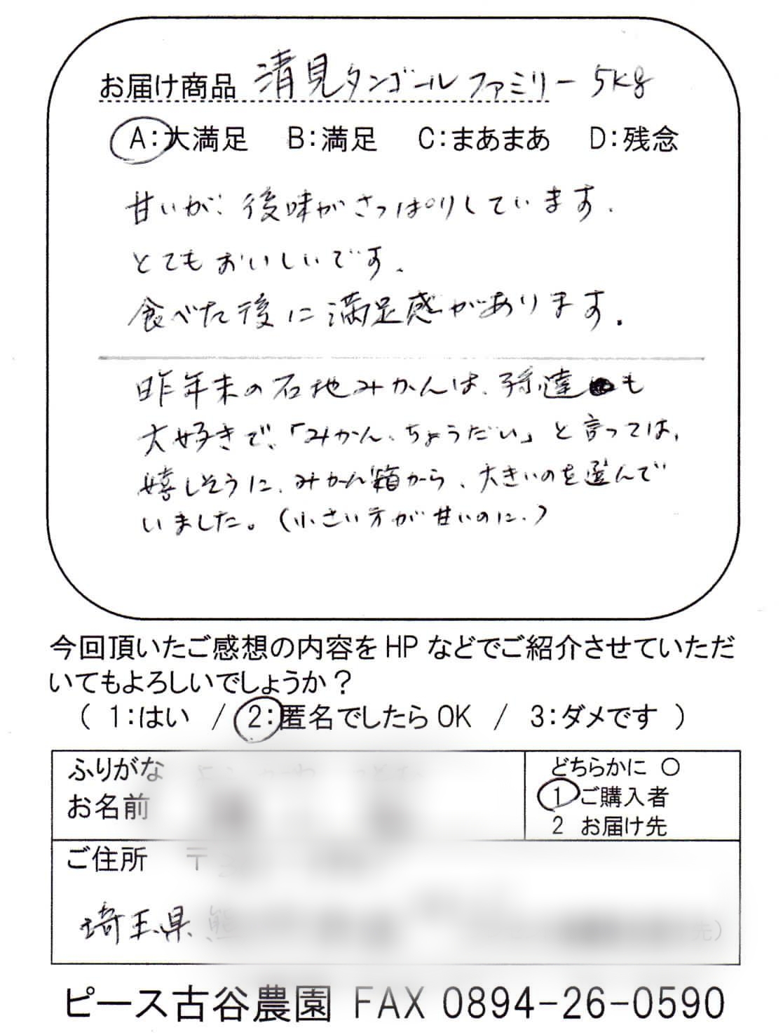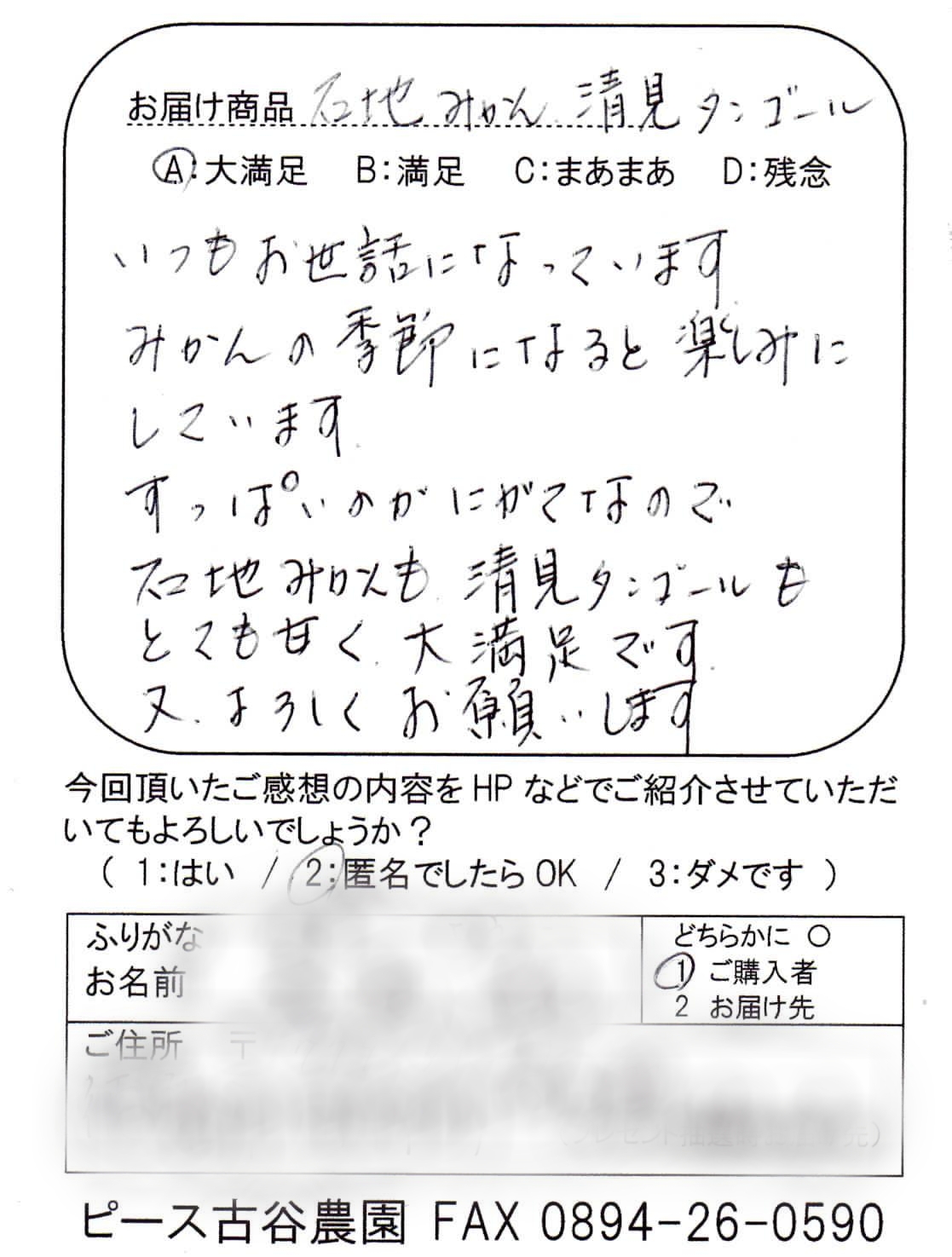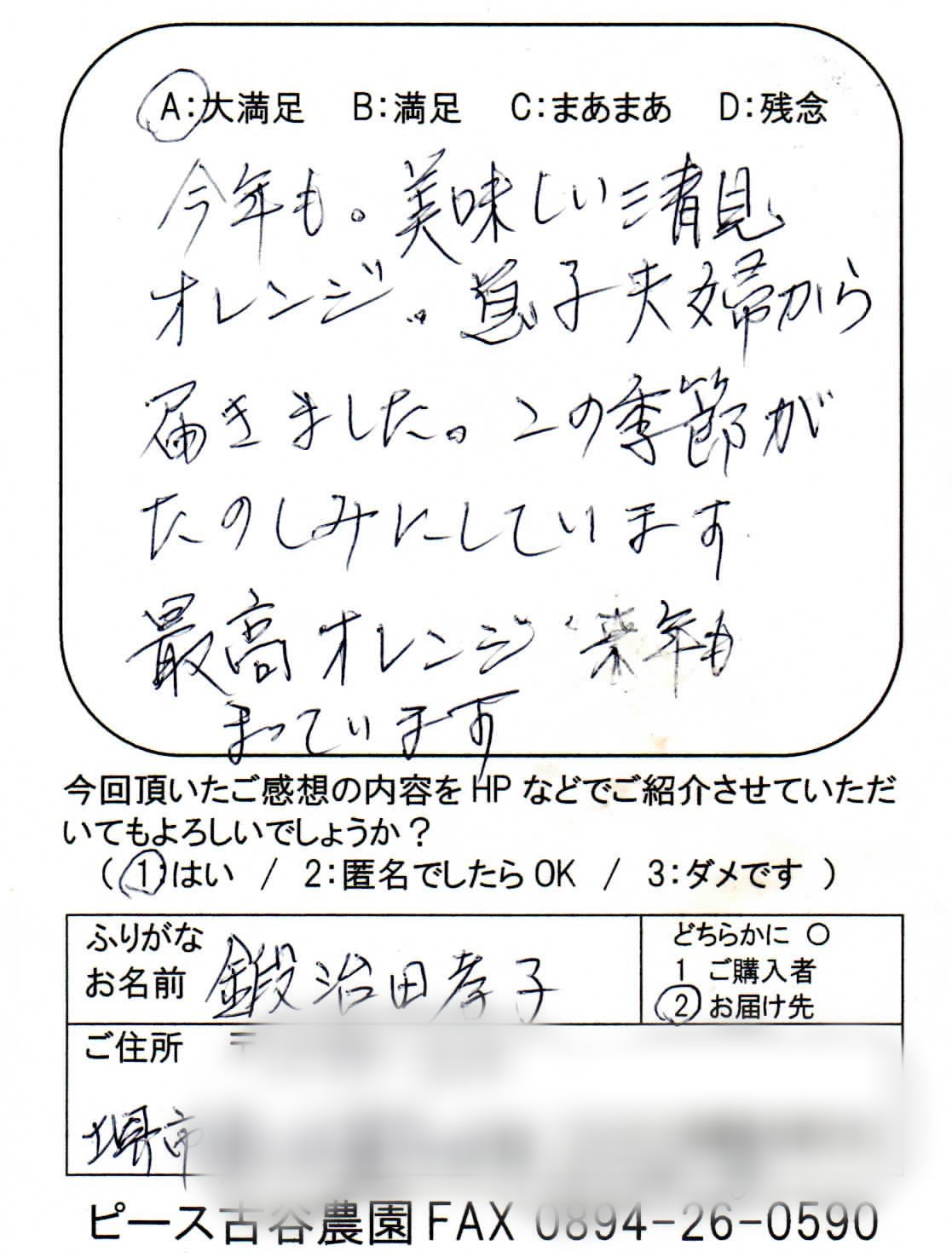 当園の清見タンゴールをお届けした皆様から嬉しいご感想、温かいメッセージをたくさん頂戴し、いつも励まされて農作業に取り組んでいます。頂いたお葉書をいくつかご紹介させていただきます。